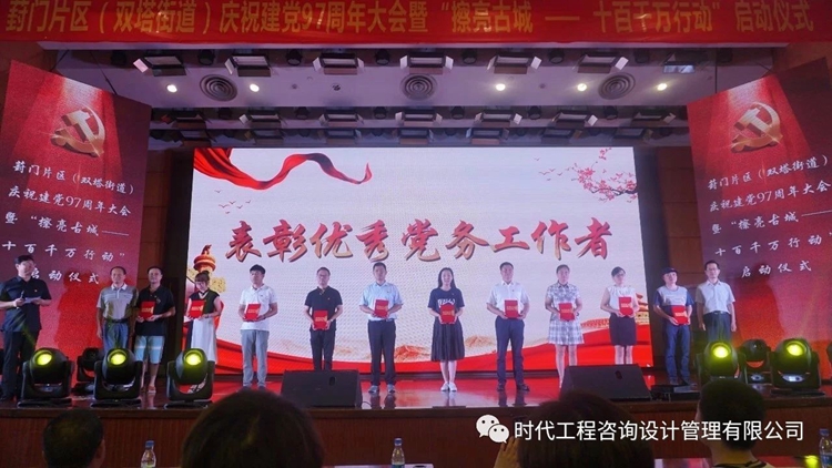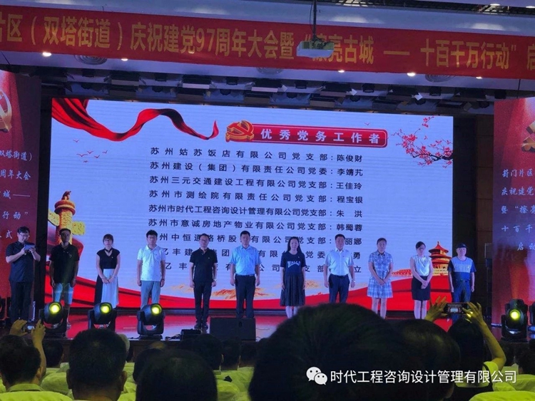 蘇州市時代工程咨詢設(shè)計管理有限公司黨支部組織委員朱洪在會上榮獲“優(yōu)秀黨務(wù)工作者”榮譽稱號的表彰。